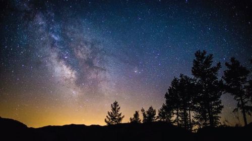 夏季是欣赏银河的最好季节,可以看到夏季银河横贯天际。在来自城市的光污染之上,是色彩绚烂的银河中心区域,火红的天蝎座偷偷露出了头,与下面的群山和树林构成了一幅美丽的画卷。