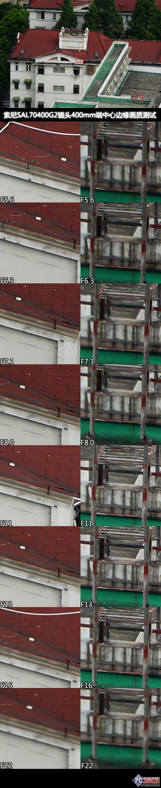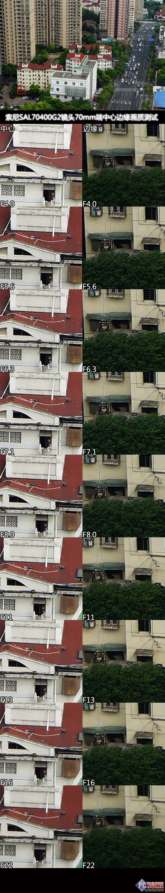 又到了画质测试环节,还是先从70mm广角端对索尼SAL70400G2进行测试。中心部分画质方面,最大光圈F4.0下即显示出不错的锐度,并且细节和层次保留丰富;随着光圈的收小,F5.6和F6.3的锐度逐渐提高;到了F7.1和F8.0时,达到了镜头广角端中心部分的最高画质,直到F16以后,画质开始有明显下降。然而,出人意料的是F4.0时锐度与中心有一定的差异外,镜头广角端中心和边缘间的锐度差异比较小。