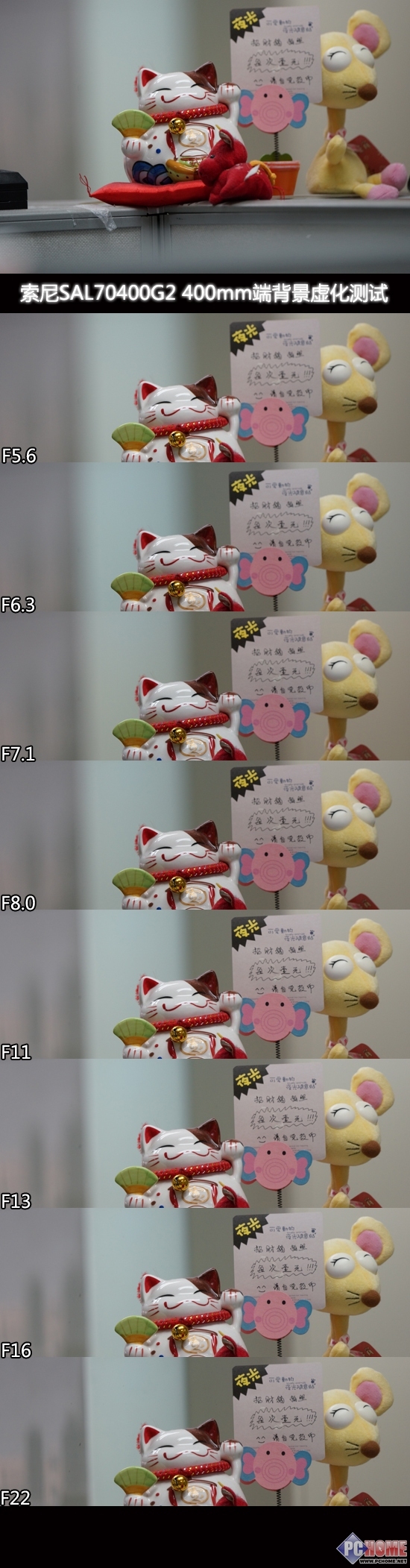从下图中可以看到,即便是F5.6,在400mm端都能产生非常强烈的浅景深效果,而距离猫非常近的标牌上面的字都是模糊的;随着光圈的逐级缩小,标牌上的字愈加清晰,直到F11时字的清晰度大致与招财猫差不多了;而到了F22,背景的虚化效果依旧非常强烈。如之前所想象的那样,400mm在全画幅下的虚化效果真不是盖的,并且没有出现二线性现象。