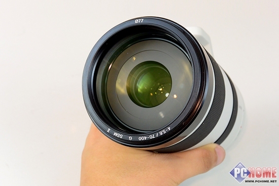 由于是一款通用性的大倍率超长焦变焦镜头,镜头的口径77mm并不算非常大。从前组镜片上看去,全新的AR镀膜颜色为黄绿色,在某些角度会泛出一阵金色的光显得高端大气。