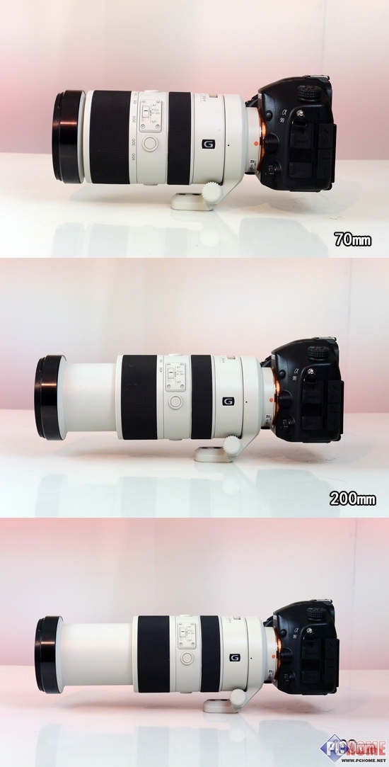 索尼SAL70400G2采用推拉式变焦设计,小编分别以70mm、200mm和400mm对镜头的伸缩长度做了一个非常直观的比较,总体来讲在400mm相对于70mm,镜头伸长的幅度还是非常大的。