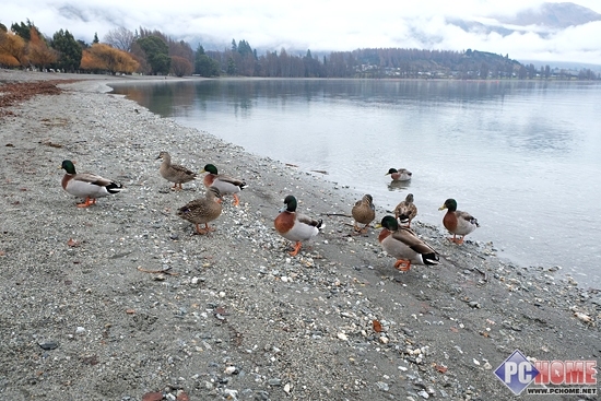 欣赏完了瓦纳卡少年橄榄球队的精彩表演后,雨开始渐渐的小了,随后我们在瓦纳卡湖南端的鲁瓦湾欣赏湖边的美景,但是沿街大树上的叶子都已经慢慢凋零干净了,心想如果这里是秋天该会有多浪漫啊,一定是金灿灿的一片,可惜当天雾气太重,隔岸的景色什么都看不清,正当我们在岸边行走拍照时,成群结队的鸳鸯飞到了湖边嬉戏起来,随后还结伴上岸向我们讨食物吃,可惜随身忘记带小面包了,不如肯定好好的饲喂一番。