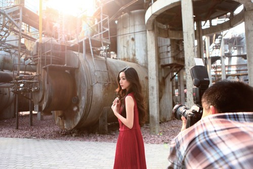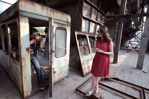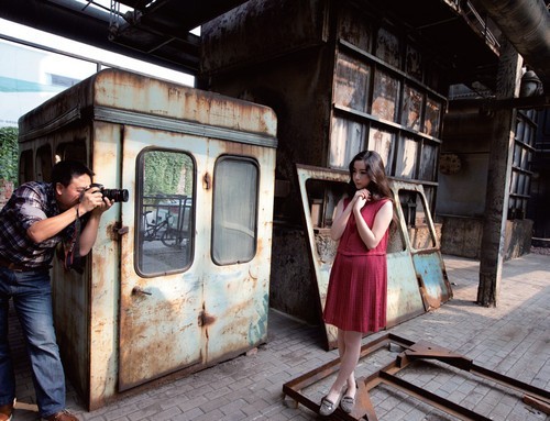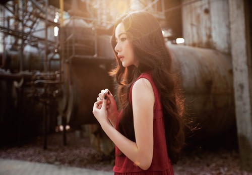 人像拍摄新手习惯于切着人物半身或头部拍摄局部,这样的作品传递的信息非常有限。随着拍摄的深入,要锻炼拍摄环境人像的能力,让人物与环境的线条、色彩、 光影相结合,获得更加丰富的表达。这幅作品将环境的线条纳入画面,工业化繁复细密的结构及冷调色彩,映衬了模特的柔美,红色的服装与环境产生了冷暖对比。 拍摄时对准模特额头高光处测光,略微降低曝光补偿后闪光灯拉出反光板,借助小面积反射补光适度照亮模特身体,从而保留画面光线的整体素描关系。