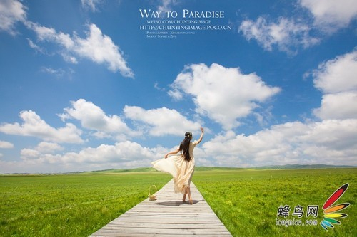 用大广角低角度拍摄,风吹起长裙和长发,蓝天白云下,背影也那么动人而且回味。模特一手签着长裙,一手伸起手,双脚交叉踮起,姿势优美,且和自然融为一体。