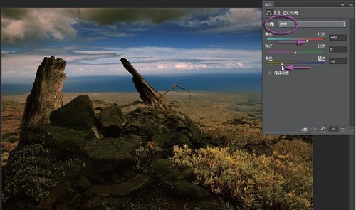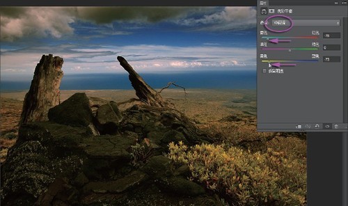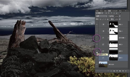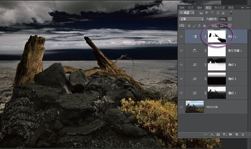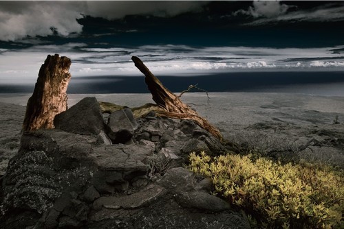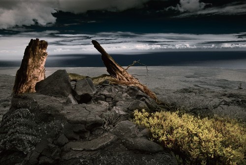 经过这样6个调整层的操作,图像呈现出一种苍凉冷峻的氛围,天很高,云很重,海很远,地很静。岁月流过,岩浆不再凶狠,枯树沉默,昔日的拼杀变成今天的相依。就在这里,新生的植物已经蔓蔓而起,假以时日,他们还会有高大茂盛的那一天。