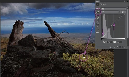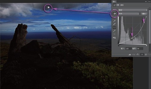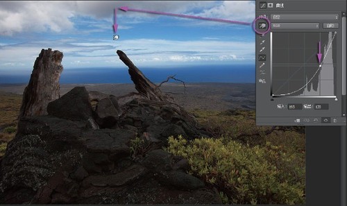 在弹出的曲线面板中选中直接调整工具。将鼠标放在天空云彩的暗处,按住鼠标向下移动。看到曲线上相应的控制点向下压,让曲线与直方图形状大致相符。