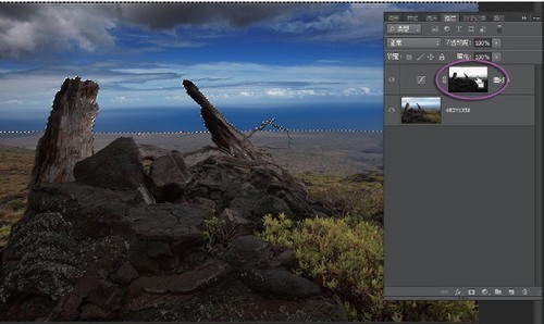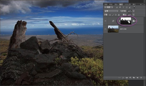 按住Ctrl键,用鼠标在图层面板的曲线调整层中点击蒙版图标,看到蚂蚁线了,这样就载入的曲线调整层的天空选区。