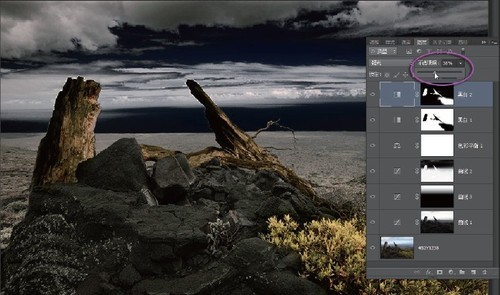 图层面板上,当前层是黑白调整层,打开上面的不透明度,将滑标慢慢向左移动,看到图像中的色彩逐渐恢复。感觉放在70%左右片子的整体效果比较满意。
