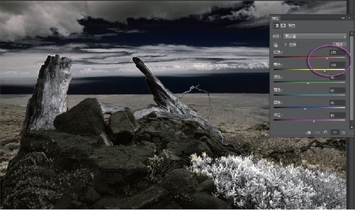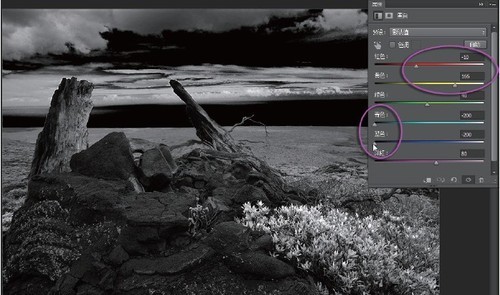 在弹出的黑白面板中,尝试各种参数组合效果。例如,略降低红色参数值,枯树干暗了。大幅度提高黄色参数值,新生植物亮度大大提高。把青色和蓝色参数值降到最低,天空暗下来了,云彩更突出了。
