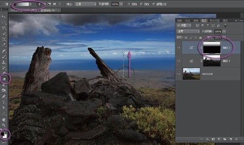用渐变工具在海天交界的地方从下向上,从地面到天空的一半位置拉出渐变线,在蒙版的遮挡下,只有天空的上半部分更暗了,其他部分恢复原状。
