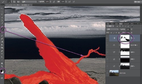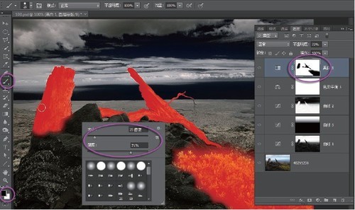 工具箱中选画笔,前景色为黑,上面选项栏中设置合适的笔刷直径参数和最低硬度参数,将图像中倒下的树干和新生的植物涂抹出来。对于不同的地方,需要调整画笔的直径大小,以适应涂抹的需要。