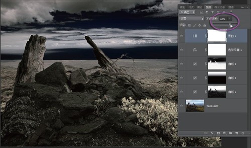 再打开当前层的不透明度参数,将滑标逐渐向左移动大约在40%左右,看到树干与新生植物的影调和色彩都满意为止。