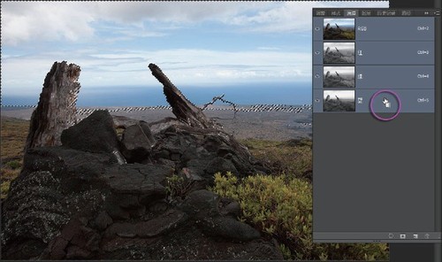 要压暗天空,先载入天空的选区。打开通道面板,按住Ctrl键,用鼠标点击反差最大的蓝色通道,载入蓝色通道选区,看到蚂蚁线了。
