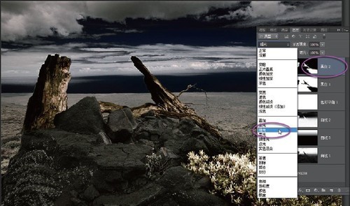 打开当前层的图层混合模式下拉框,逐一尝试各种不同的图层混合模式,感觉“强光”模式效果比较合适。