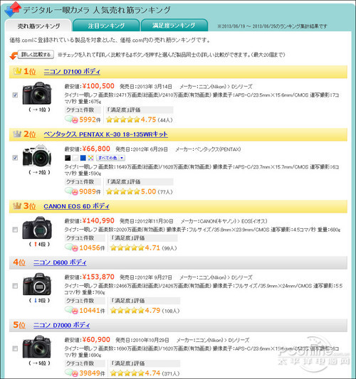 从日本kakaku.com网站可换镜头数码相机排行走势可以看到销量排行、关注度(人气)排行以及满意度排行,其中前两者的参考价值最大。