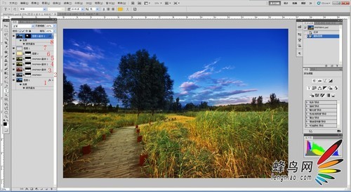 如图,图层序号的1、7、8主要负责地平线以上部分,其余都是负责地平线以下部分。用蒙版将图层融合。如图所见运用了大量的图层叠加,这里没有 固定的套路,自己可以挨个试,如果觉得一种效果满意,但是稍微又过了一些,这时候可以调整透明度达到满意效果。菜单--图层—调整里的部分工具也是常用 的,如曲线、色阶、色彩平衡等。