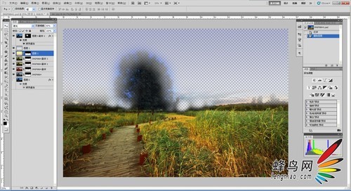 图层序号8的作用是复制图层序号1,然后把那棵碍事的树单独擦出来,以免被其他图层影响。