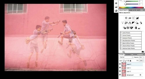 将四张图按顺序排列在背景图层上,并且降低透明度。然后使用蒙板扣图,将重叠的部分擦掉,让整体更自然更真实。
