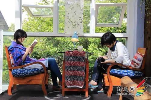 将相机从桌上拿下来放在对面的椅子上,然后将镜头调近,能够拍下所处的环境,因为角度低,所以广角端可以最大范围的容纳下所有的细节,将相机设置到连拍模 式,这个时候就你就可以和你的同伴毫无顾忌的畅所欲言,相机也适时的帮你捕捉下两个人表情状态最快乐最默契的时候。