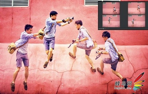 这是拍下的四张图合成,所以把相机放在一个地方固定不动,后期也更方便,采用平面构图,画面看起来更简洁流畅。在构图时,可以不拍下地面,这样会给人飞跃的感觉,如图只拍摄了墙壁部分。