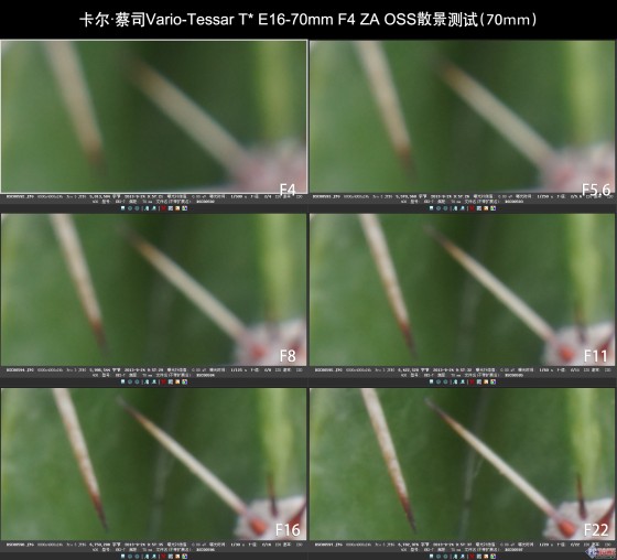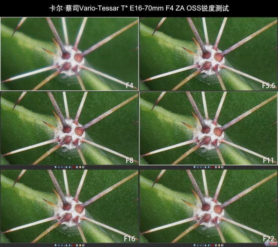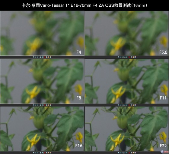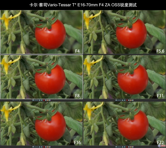 我们将镜头选择广角端及长焦端进行测试,可以非常明显的看到,广角端当全开光圈时,西红柿上的细节并不是很明显,而收缩光圈到F5.6开始,画面锐度提升;长焦端时,F4全开光圈时,有比较明显的绿边,画质成像较为松软;当收缩光圈到F5.6开始,该现象消失,锐度明显提升,F16时画质开始下降,最小光圈衍射现象比较明显,带来较大程度的画质下降,因此得出结论是,Vario-Tessar T* E16-70mm F4 ZA OSS最佳光圈集中在F8左右。