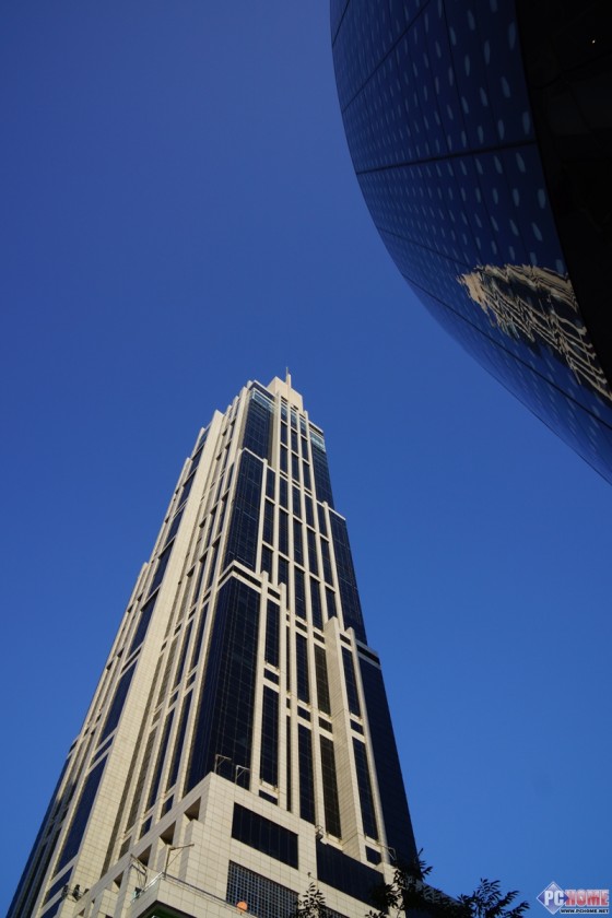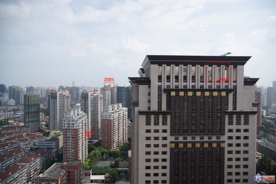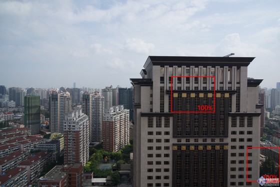 这张拍摄的时候,太阳已经从东边升起,且是向南拍摄,因此天空有点泛白,主要想要测试下该镜头对于复杂的城市景色的分辨率表现,当然清晨有晨雾存在,一定程度上影响了画面成像。