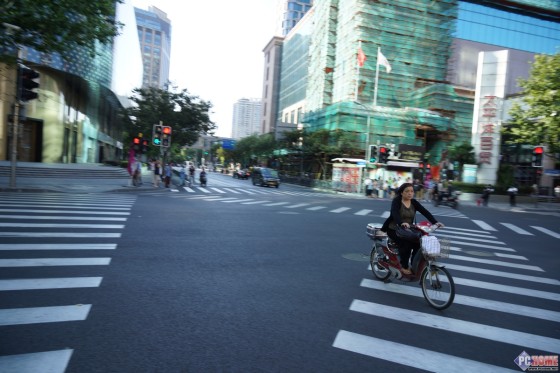 我们选择对焦点在自行车前部,观察纵向的自行车焦外部分,焦外还算不错,当然最吸引人的莫过于颜色的还原上。