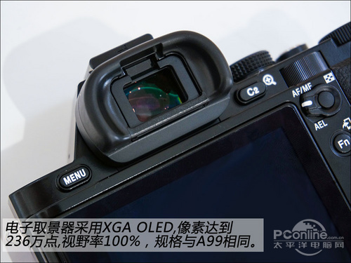 索尼A7系列实用的是XGA规格的电子取景器,与A99配置相同,显示效果细腻,与光学取景器相比也不为过了,刷新帧率等也比过往的产品要好。取景器设置在机顶中央还是头一次,尖顶的设计也尽显复古的味道。