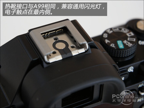 热靴接口,索尼A7采用的是与A99相同规格的新型设计,支持通用热靴的闪光灯,数据交换在热靴内侧。