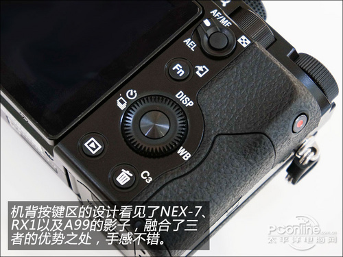 机背按键,索尼A7融合了RX1、NEX-7与A99的一些设计元素,宽大的手柄握起来像NEX-7,按键以及转盘设计采用了RX1的样式,而诸如对焦模式拨杆的设计,又沿用了A99,三者整合后的使用手感倒是也不错。