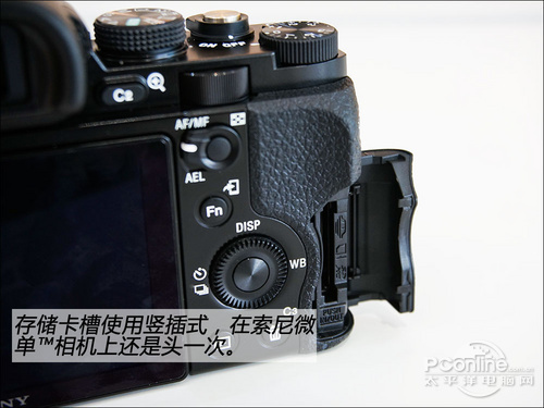 存储卡槽,A7是索尼第一次设计为竖插式,当然也由于手柄设计得更大的缘故,留有更多空间实现这一设计。存储卡仓盖十分厚实,证明索尼所说的,A7是全天候机身,在恶劣天气环境下使用绝无问题。