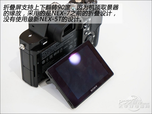 索尼A7的翻转屏采用的是NEX-7之前的旧式结构,没有采用NEX-5T那样的新型结构,当然这也由于中置取景器的原因,如果使用NEX-5T的折叠结构,液晶屏会被取景器遮挡。