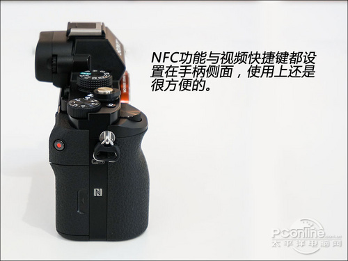 索尼A7与NEX-5T都搭载了NFC功能,同样设计在手柄的右侧,一触即连的功能很方便,视频拍摄键设计在机背手柄的侧面,这个设计第一次见,没有以往设计在机背那么顺手,不过拇指启动该键也不需要改变握机手势。
