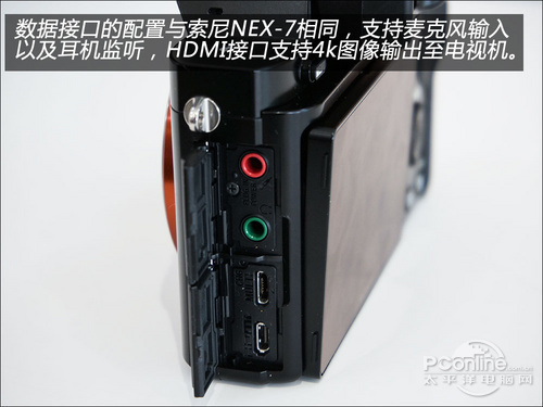 索尼A7的数据接口配置上与NEX-7相同,不过HDMI接口支持4k图像输出至电视机,未来4k规格的设备普及后,这又是一个走在前沿的设定。