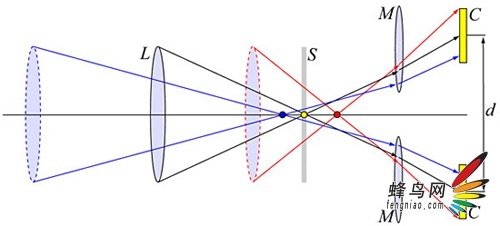 以最常见的相机对焦方式——单镜头反光相机的相位检测对焦为标分析。单反机身的反光镜由两块反光玻璃构成——主镜和辅镜。主镜中心部位是透明, 对应着辅镜。主镜与辅镜一起将镜头成像光线投射至毛玻璃,辅镜会反射一部分光线到达镜室底部——相位检测自动对焦模块。模块中有两个小透镜、各自撷取在对 焦点区域两边影像的小部份,再投射到分成两组的CCD数组上。概念上这两个小透镜的位置在感光芯片后方,它们把撷取到的影像在CCD数组上聚焦(见下 图)。如果镜头对焦准确,这两个重新聚焦的像会在各自CCD数组中央(图中黑线),两者之间(预先知道)的距离是对焦准确时的相位(phase)。但若镜 头成像位置在感光芯片前方(图中蓝线),CCD上像之间的距离比较近,也就是相位比较短;反之,但若镜头成像位置在感光芯片后方(图中红线),CCD上两 个像之间的距离比较远,也就是相位比较长。所以,从比较准焦相位和非准焦相位之间的差异,就可以算出镜头对焦时的移动方向和距离,再向镜头下达移动的指 令、一次把镜头放到定位,从而对焦成功。