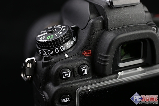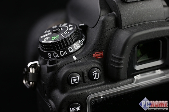 熟悉的左侧按键布局。尼康D610为了提升操作时的手感在机身上设计了凹槽来搭配每一颗按键达到理想的手感和不容易误操作的键程。当然我们也可以看到足够宽敞的左侧宽度为以后升级液晶屏的尺寸留下了余地。