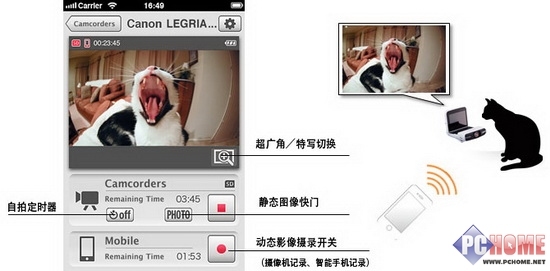 拍摄者可以在Wi-Fi®范围内利用智能手机或平板电脑对LEGRIA mini进行远程控制拍摄。随心控制开始、停止、动静态影像记录、超广角与特写切换等,并可保存在智能移动终端或摄像机上(如下图所示),适用于拍摄儿童或宠物自然的状态。