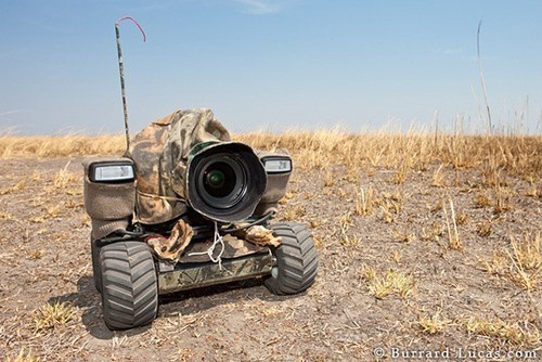 如何,这是聪明人的工作方式吧。如果你家中有孩子们玩腻了的遥控车,稍加改装,也可以像"甲壳虫"一样驮着你的拍摄利器,在动物界横着走了。但是风险一定 是存在的,假如哪个大家伙看着你的镜头不顺眼,一巴掌给你拍个稀巴烂也是有的,你的心情可能马上会不好了。另一方面,如果你能得来一张常规方法拍摄不到的 大片,你会觉得一切冒险都是值得的。