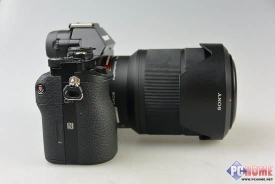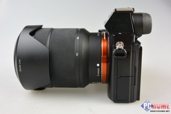 从侧边看,机身整体有一些硬朗,电子取景器位于机身的后方,总的来说,这款产品并没有给人一种庞然大物的感觉,但是和之前所有的微单NEX系列产品相比,还是比较跨时代的,颠覆了所有的产品的设计风格。