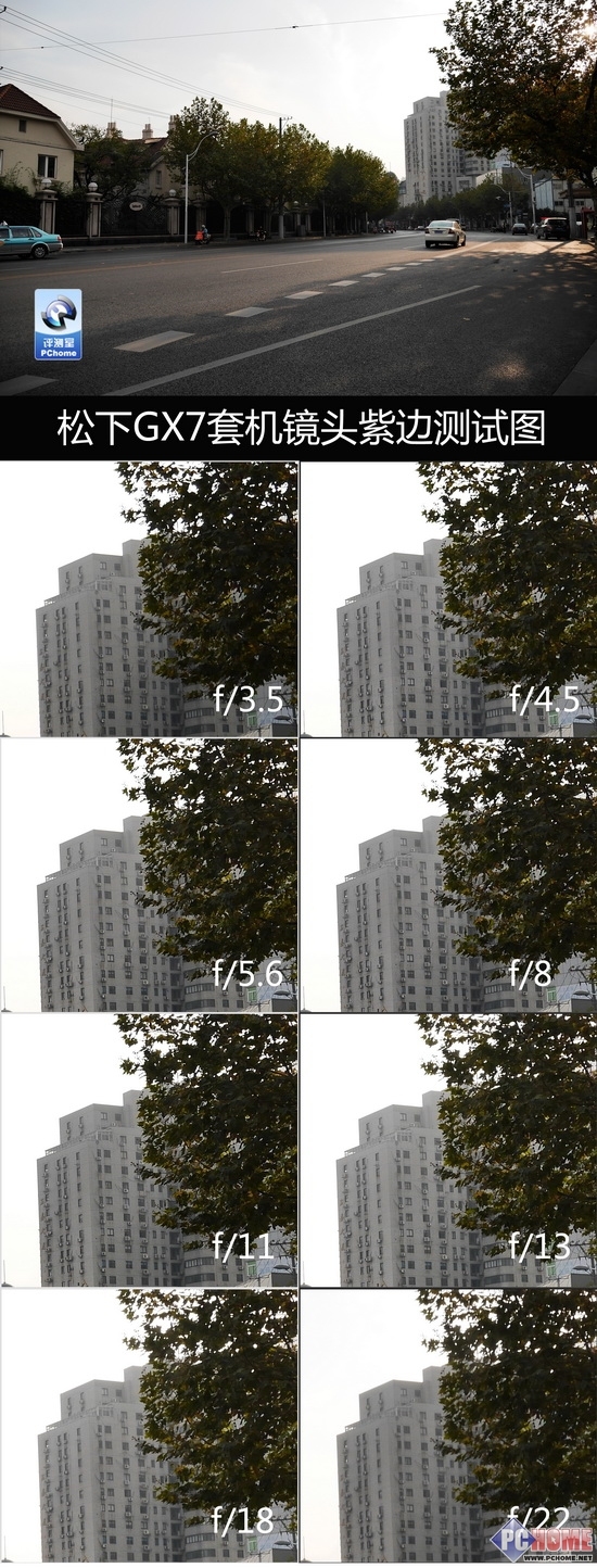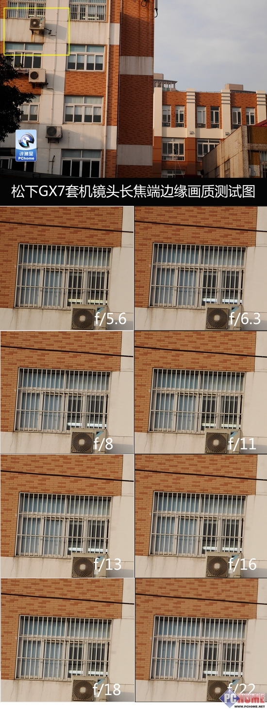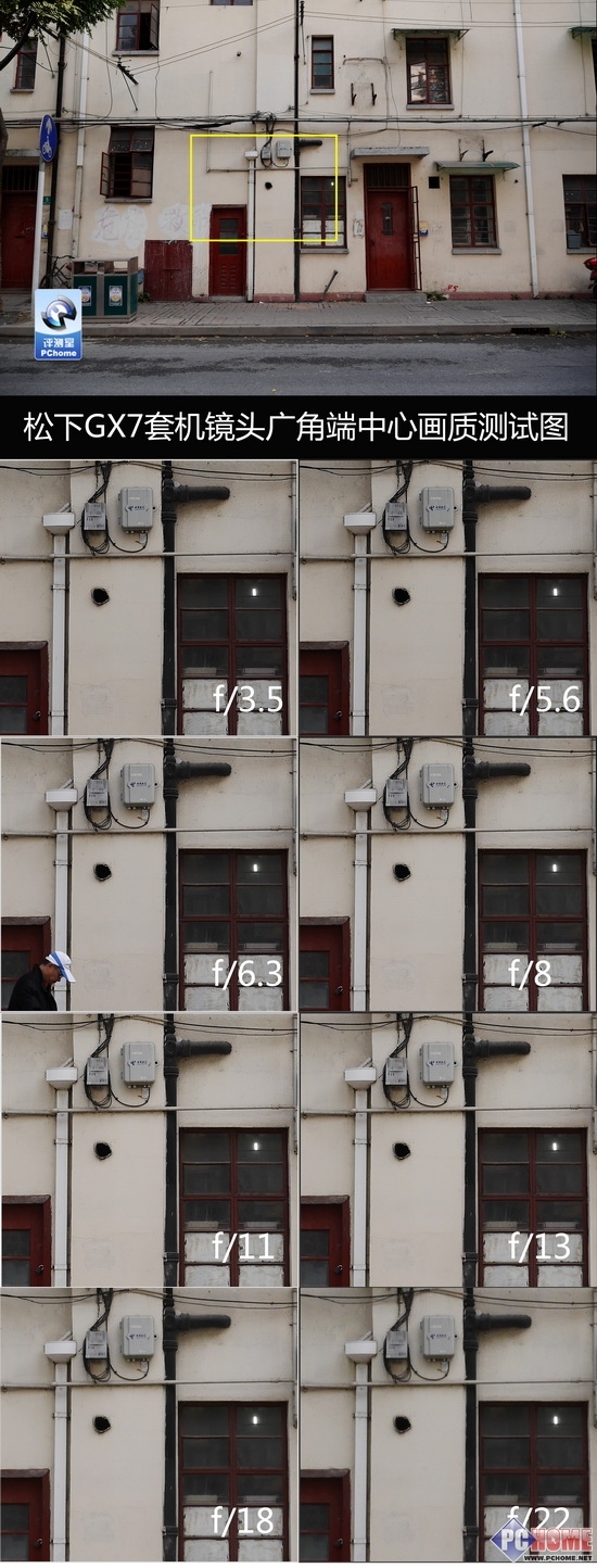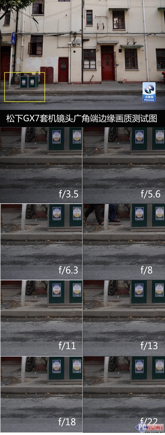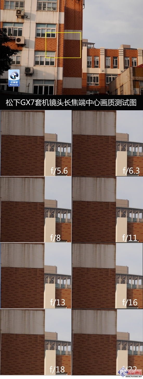 在这里我看到,和之前广角端的测试结果基本相同,在F/13-F/16的时候画面的中心锐度表现非常不错,但是在F/16的时候画面整体锐度开始下降。事实上,我们看到在长焦端的最大光圈F/5.6的时候我们看到松下GX7的确非常锐利,和去除了光学低通滤镜应该有直接的关系。