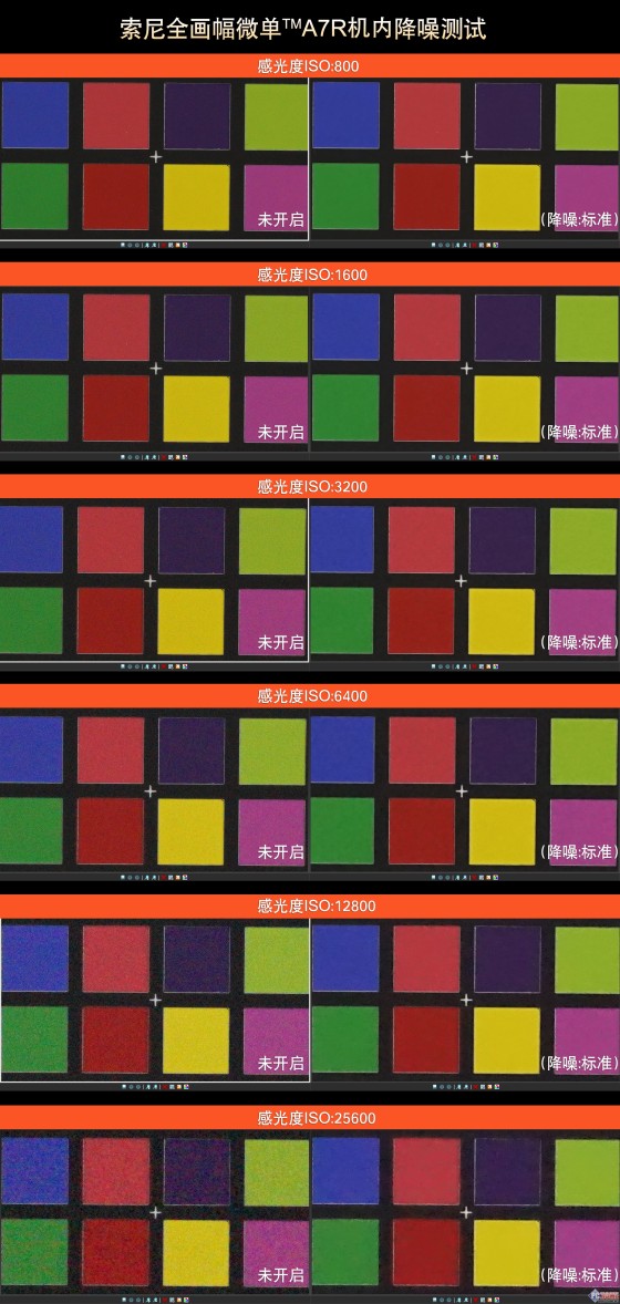 通过开启索尼全画幅微单TMA7R内的机内降噪,我们从ISO 800开始对比,可以非常直观的看到ISO 1600时就有比较明显的修正噪点的效果,虽然一定程度上会损失一些画面的细节,包括在ISO 6400启用降噪后有较为明显的涂抹痕迹,不过依然是在弱光环境下使用高感光度拍摄不可或缺的功能。