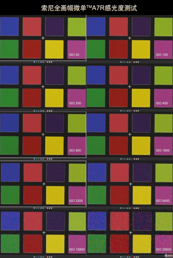 索尼全画幅微单TMA7R最为瞩目的莫过于那块高达3640万有效像素的影像传感器,可以达到7360×4912的超高分辨率,我们接下来将测试其感光度表现。由于索尼全画幅微单TMA7R的感光度范围覆盖ISO 50-25600,我们通过100%放大对比来一探感光度表现。