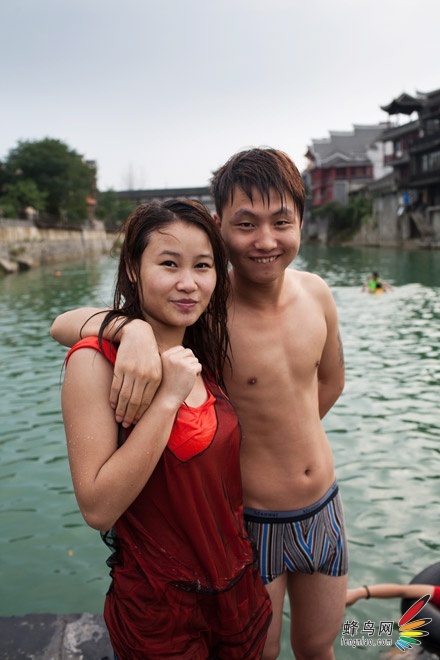 第二幅 2012年夏,湘西吉首的峒河边,这里的女孩游泳不用泳衣,直接和衣跳入水中,女孩让我给他们留影,然后转身一脚把男朋友踹入水中。