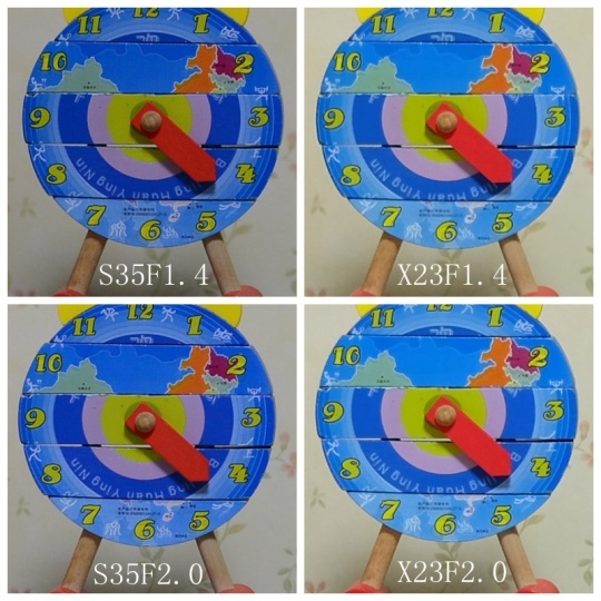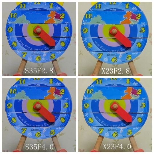 随着光圈的缩小,我们可以看到X23的分辨率开始明显提升,在F4.0时已经接近S35的水平,考虑到机身分辨率上的劣势,说明这只镜头的素质已经非常好了。不过我们依然要对S35中央分辨率的稳定表现肃然起敬,可是称得上是如刀锋一般的锐利。