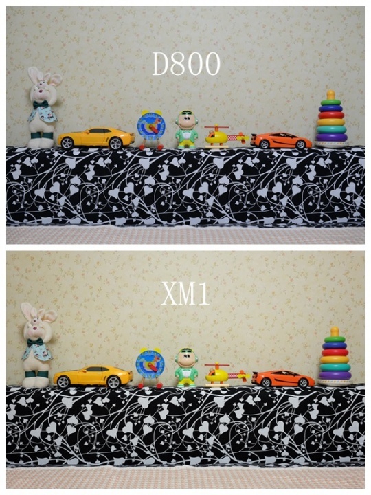 先说一下测试场景,自家客厅,没啥像样的拍摄物,只好拿儿子的玩具充数了。光源为白色节能灯。D800的自动白平衡略微偏青,而富士的稍暖。为了使 图片放在一起好对比,避免曝光上的差异,拍摄时均使用了曝光补偿,确保两个相机拍出的图片直方图是接近的(这块发现了富士的一个重大问题,稍后会表)。