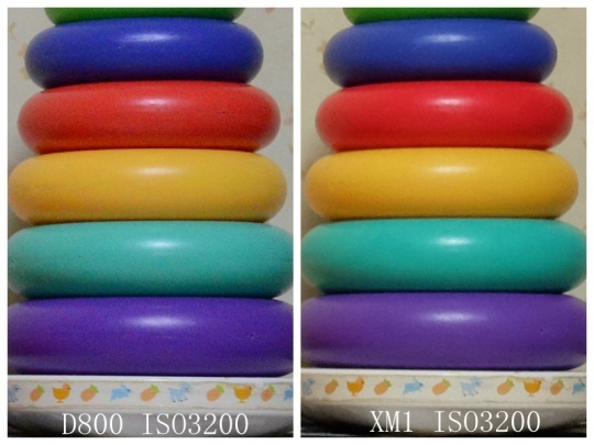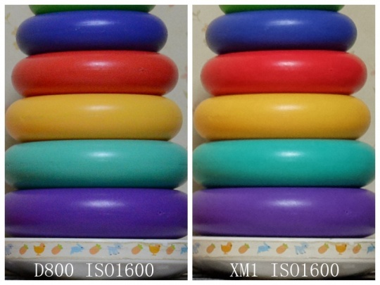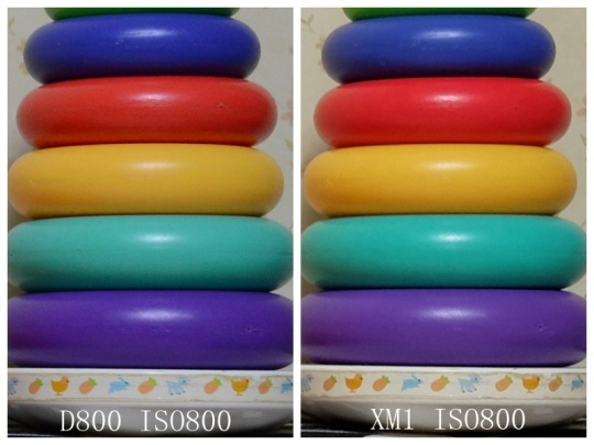 先来看ISO800的。两者非常接近,都比较干净,但是请大家注意最下方那个紫色的彩圈,D800的色彩有很大偏差,实物的色彩很接近XM1的片子,富士色彩准的优势在这里体现出来了。