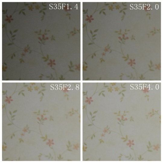再看S35的边缘部分。首先,在把D800的暗角控制关闭后,S35的暗角还是比较严重的,特别是在最大光圈下;但从F2.8起暗角基本消失, 也算达到一支优秀镜头的水平。这里发现一个奇怪的现象,S35的边缘成像提升很慢,F1.4、F2.0与F2.8三档的画质都是极为接近的,只有到 F4.0时边缘画质才有明显提升。这到底算很好,还是很糟糕呢?我也很难回答了。当然也可能是个体差异造成的。
