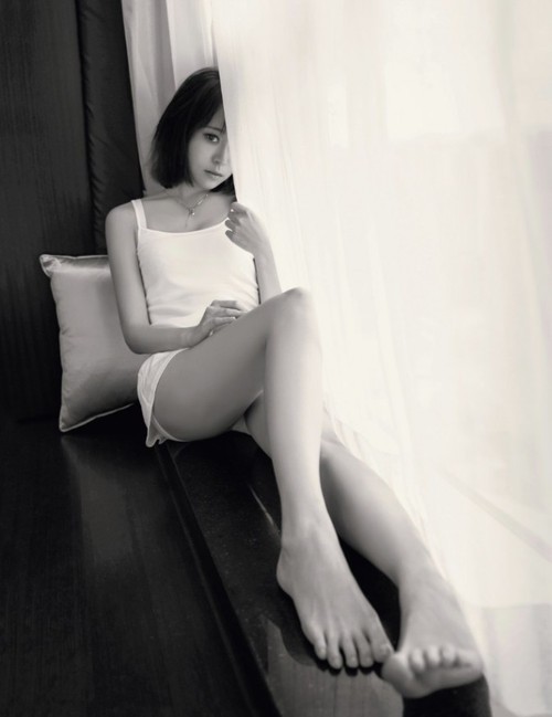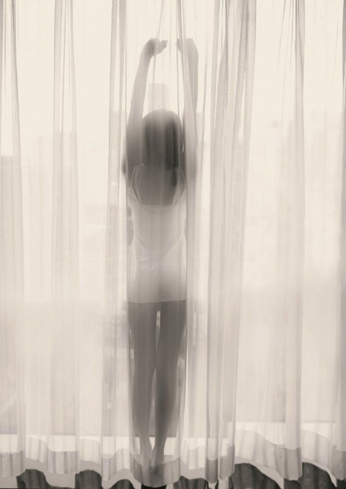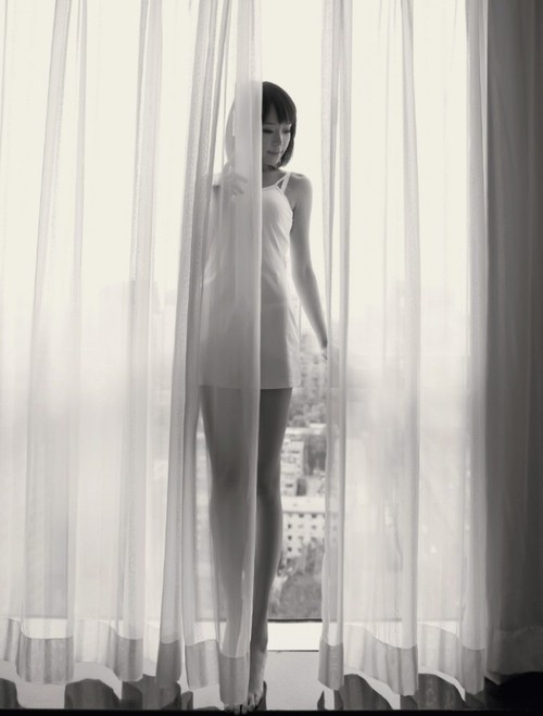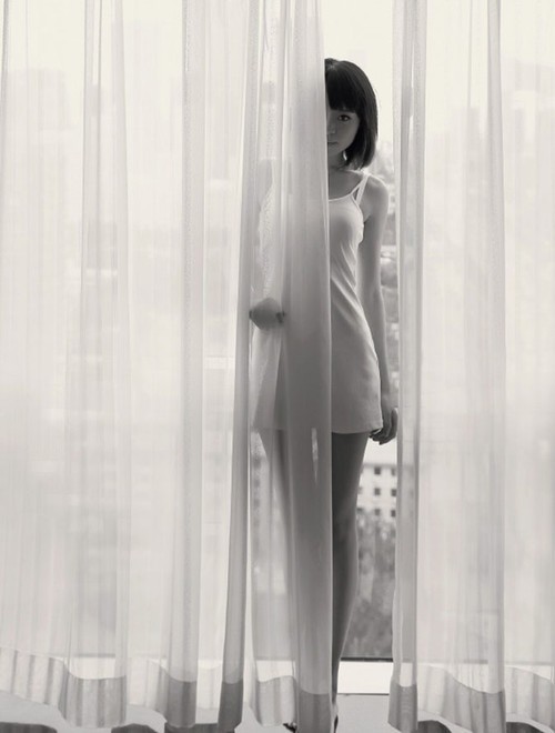 如果让女孩在窗户边坐起来,首先需要做的就是改变拍摄机位,一味地在正面拍摄侧面照会让坐姿的画面变得平庸,因为无法近距离捕捉到女孩的面部表 情与眼神,最佳的拍摄位置在窗户的一边,可以把窗户前的区域看做是一个完整的空间,这样竖构图拍摄就可以让女孩的双腿变得修长,也可以让整个身体在竖幅构 图中成为画面中的对角线。让女孩站起来又会有全新的创作风格,让女孩从室内走向外,进到帘子里去隔着一层薄薄的窗帘拍摄。一层窗帘可以很好地实现朦胧效 果。当然站起为了在纱帘之后展现出女孩最好的身姿,一定不要让女孩的身体与窗帘有过多的接触,如果造成局部“死黑”就很难看出哪些是阴影哪些是身体曲线 了,千万注意