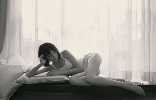 若拍摄环境是一个孤零零的窗口,在这样的环境中加入一个姑娘,再好看的身段也会在画面中显得生硬呆板。与其这样还不如直接加入一些生活化元素, 在拍摄之前对窗口做出改造。我们建议在窗台上加入两个抱枕,就可以很好地让居家环境活跃起来。接下来就可以让女孩在环境中就位了,首先不要着急让女孩按照 要求摆出任何造型,告诉她:“你在这个环境里,你觉得怎样待着舒服?”让女孩按照自己的意愿找一个自己认为最舒服的姿态。女孩会选择靠在枕头上,侧卧在窗 边。因此侧卧则成为了人体在窗前最常见也是最自然的姿态。