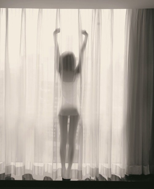 1、女孩站在窗帘后,举起双手“伸懒腰”。双手太过并拢或“与肩同宽”都会让姿势变得呆板,太过平庸的姿态无法显示出身体曲线。